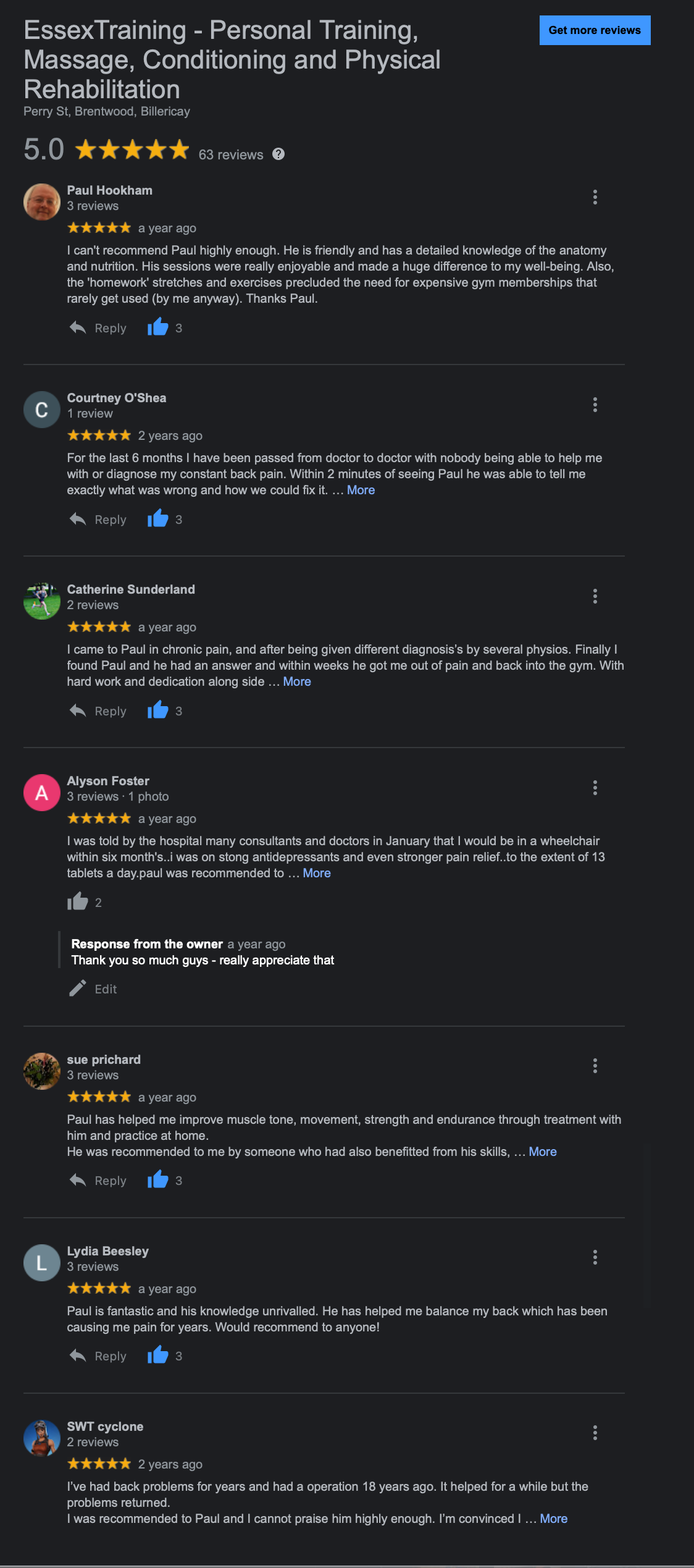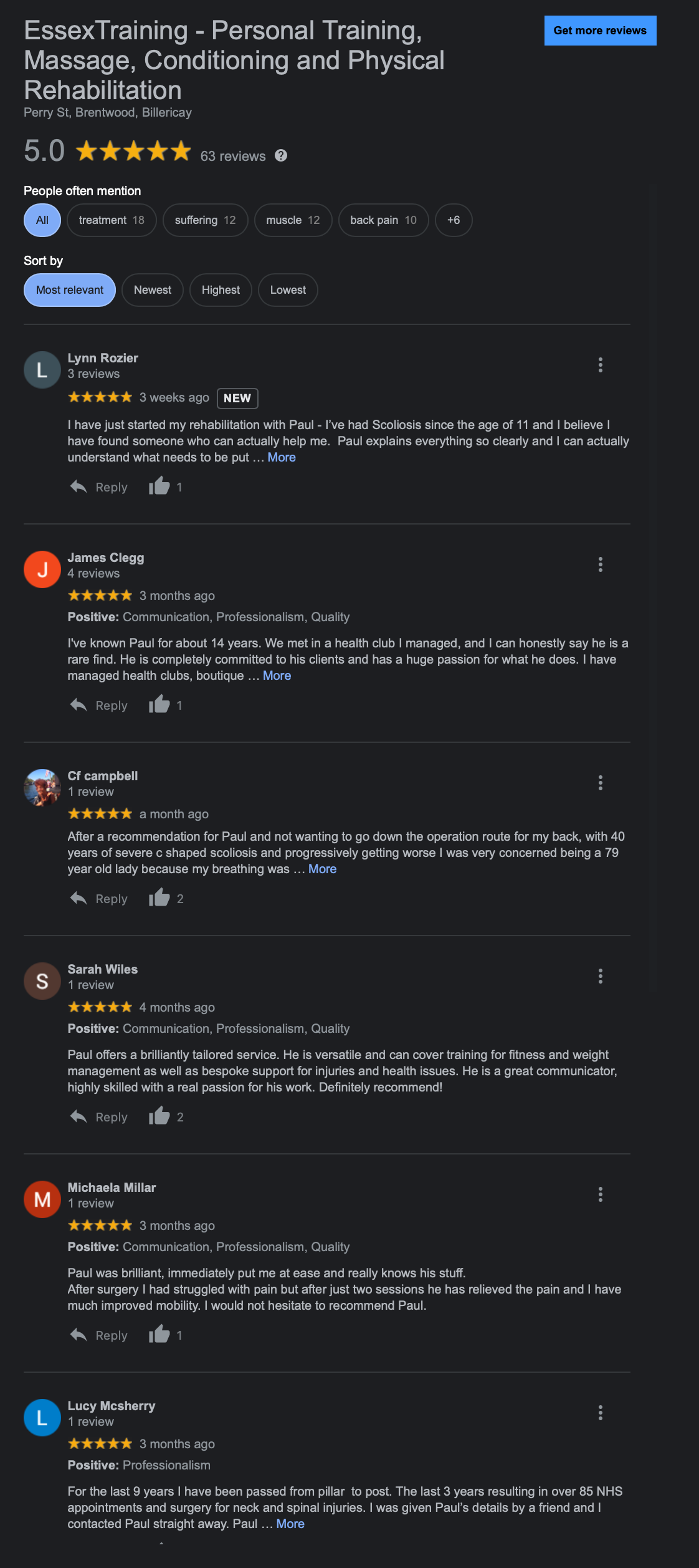 I am especially proud of my work with scoliosis and joint, back, neck and muscle pain sufferers. We have seen surgical procedures cancelled, pain reduced and confidence and mobility restored on many occasions!